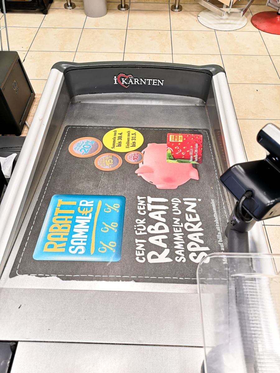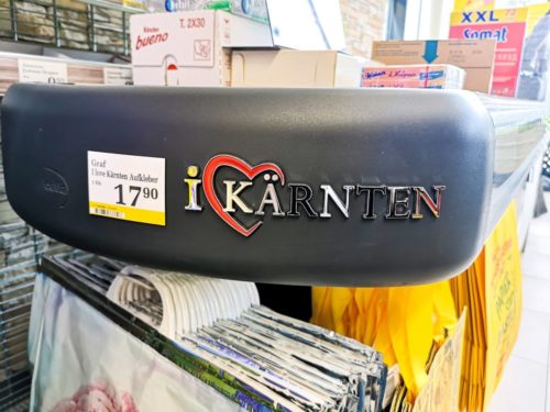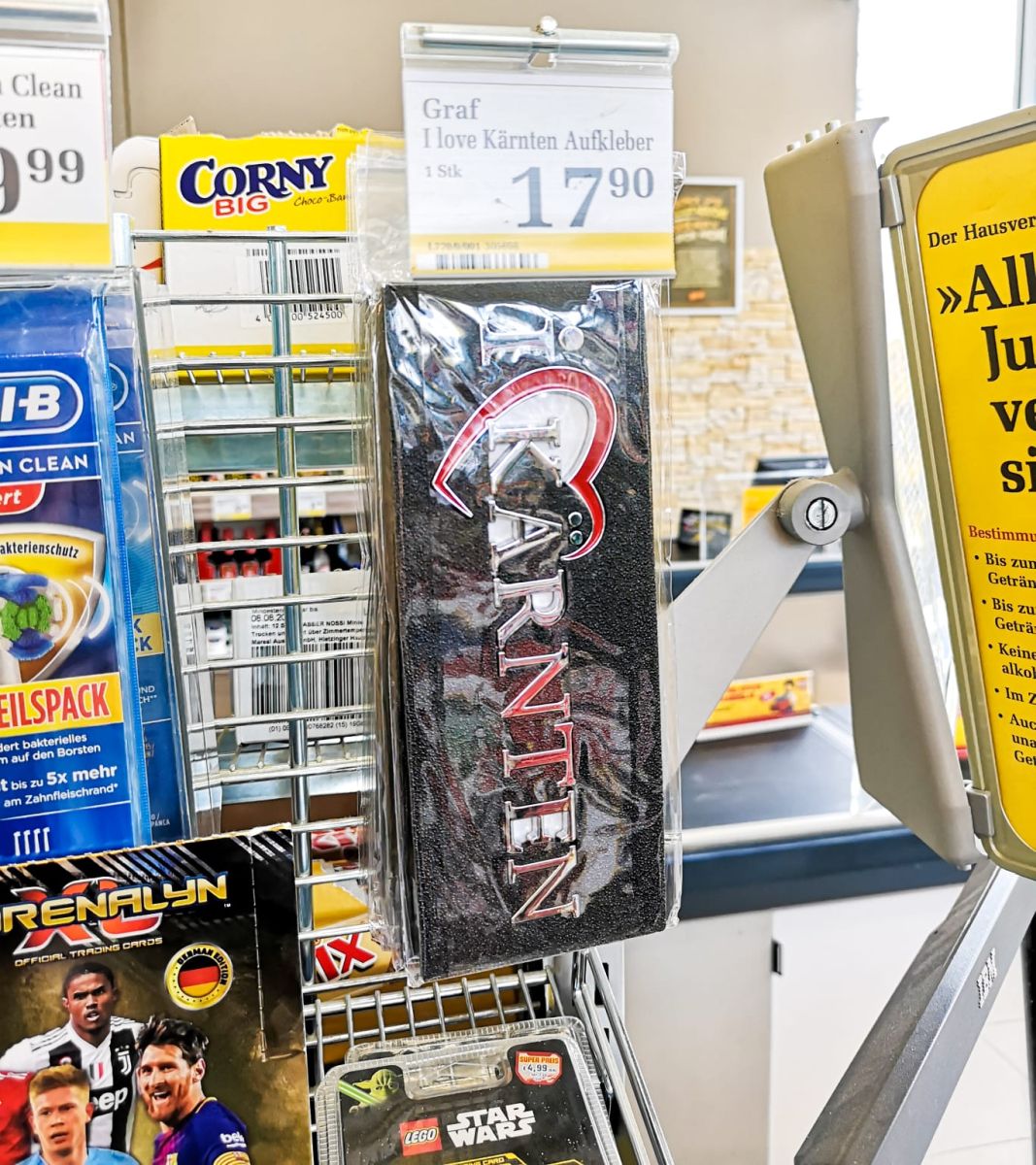 Die I Love Kärnten Aufkleber sind direkt im Kassenbereich vom Billa gelistet.