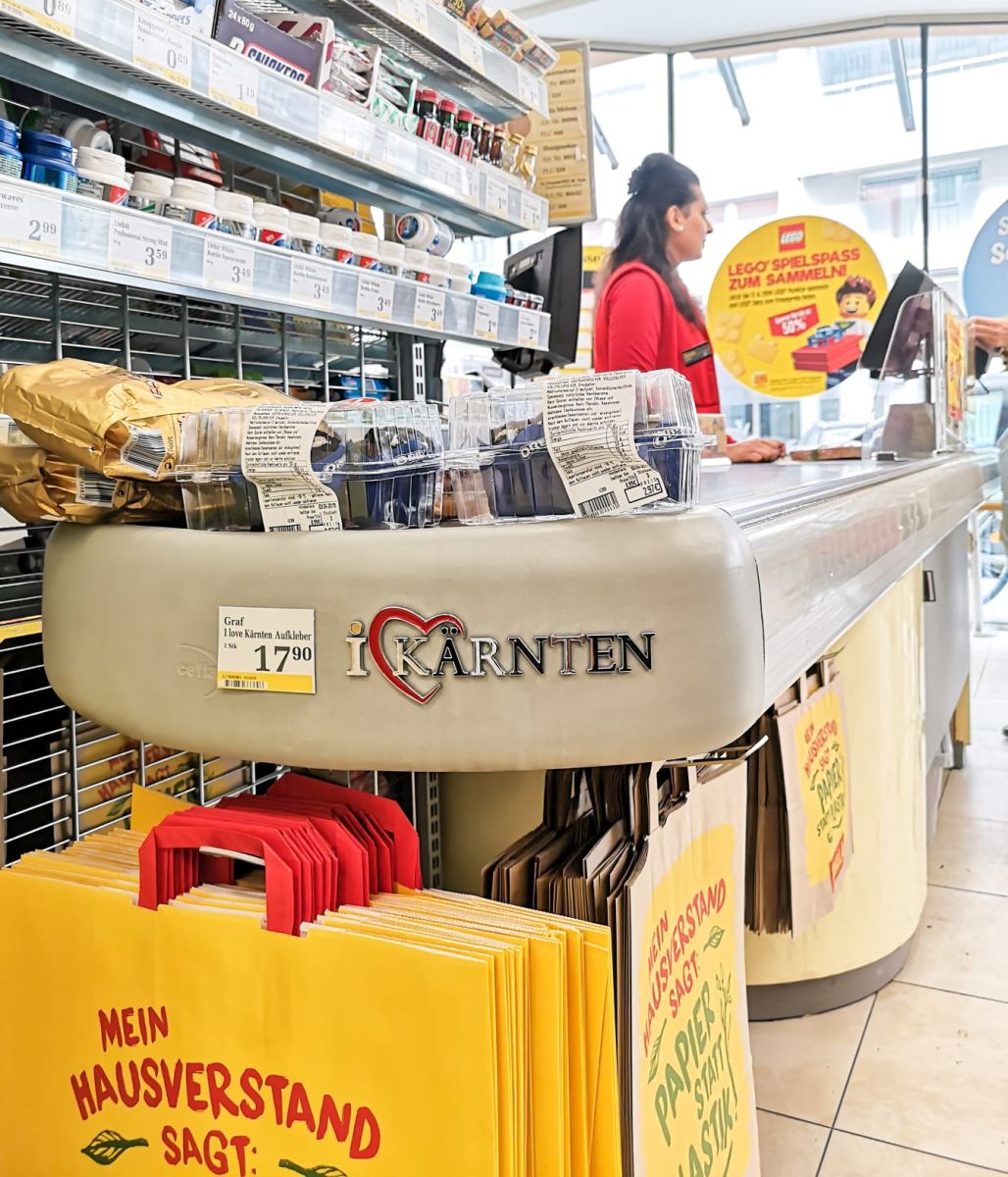 Als Vorreiter in Sachen Regionalität setzt Billa schon lange auf regionale und nachhaltige Produkte, um die Wertschöpfung innerhalb der Region zu erhalten. Mit der Kooperation mit I love Kärnten holt der Lebensmittelkonzern nicht nur ein Kärntner Unternehmen an Bord, sondern stärkt auch das Bewusstsein für Regionalität. Eine wichtige Schlüsselfigur in der Umsetzung war dabei ein Kärntner Billa-Bezirksleiter und Unterstützer der Marke. Das Thema Regionalität liegt Billa am Herzen – deshalb wurden die Autoaufkleber unübersehbar im Kassenbereich platziert.
