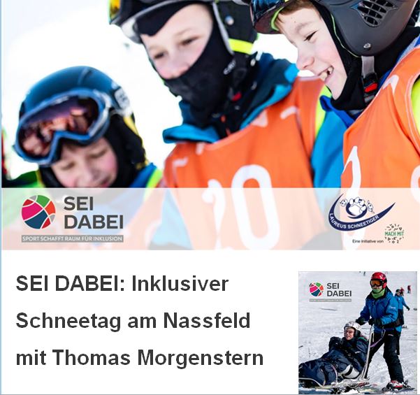 Vom 4. bis 8. Februar (Schul-Eventtag am 5. Februar) wird dann das Tiroler Kühtai zum inklusiven SEI DABEI-Treffpunkt. Und schließlich ist SEI DABEI von 13. bis 20. März erneut am Nassfeld bei der ÖBB S’Cool mit von der Partie und sorgt dafür, dass Europas größte Wintersportwoche mit über 1500 SchülerInnen für alle TeilnehmerInnen – auch jene mit Handicap – zu einem tollen Erlebnis wird.