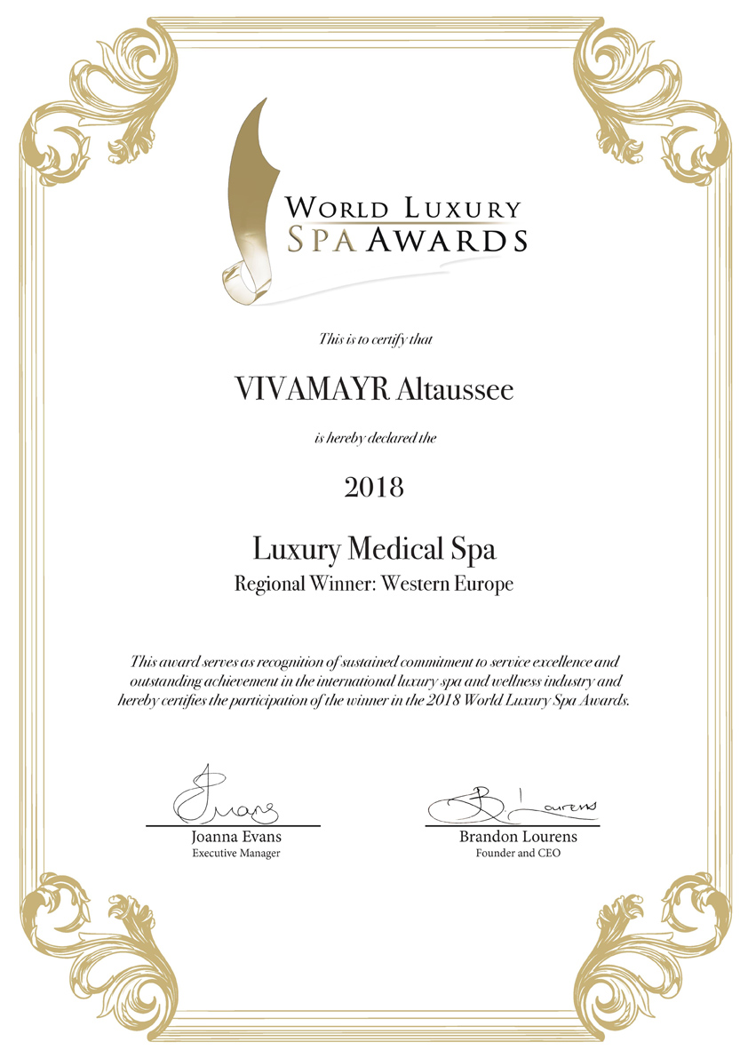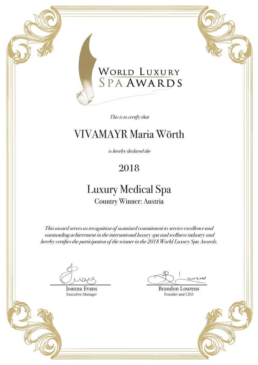 VIVAMAYR Maria Wörth & Altaussee. Am 14. Juli 2018 erhielten die renommierten Health Resorts, die sich als Lebensbegleiter zu einem ganzheitlichen Verständnis von Gesundheit sehen, den „WORLD LUXURY SPA & AWARD“ beim „2018 World Luxury Spa and Restaurant Event“ im Galgorm Resort & Spa in Nordirland.