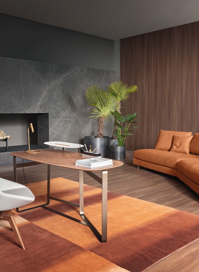 ist durch akkurate Zeichen in Anlehnung an die typischen Schreibtische aus früheren Zeiten gekennzeichnet. Der breite Einsatz von Holz an Sockel und Vorderseite der Beine sorgt für ein raffiniertes und lineares Produkt für ein modernes Ambiente oder auch für besonders elegante Räume. Für weitere Eleganz sorgt das Detail der Ablage aus Leder (optional), ein Materialmix, das dem Produkt einen Hauch Schlichtheit und Exklusivität verleiht.
