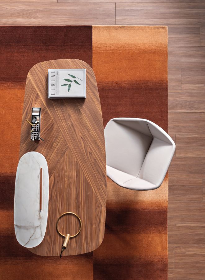 die abgerundete Tischplatte hat keine Kanten, ebenso wie die Tischbeine, die aus Metallringen mit abgerundeten Ecken bestehen. Besonderheit von Gauss ist die überhöhte Ablage, dank der sich der Tisch in zwei Ebenen gliedert: neben der Tischplatte aus Holz weist er eine praktische „schwebende“ Ablage aus Keramik (optional) auf, die mit zwei Metallstäben an der Platte befestigt ist. Eine weitere Besonderheit ist die Form der Beine, die asymmetrisch-dynamisch angeordnet sind und einen unregelmäßigen Aufbau haben, der dem Gesamtbild ein junges und lässiges Aussehen verleiht. Darüber hinaus sorgt die Holzmaserung der Tischplatte für grafische Dynamik und erhöht den ästhetischen Wert von Gauss.