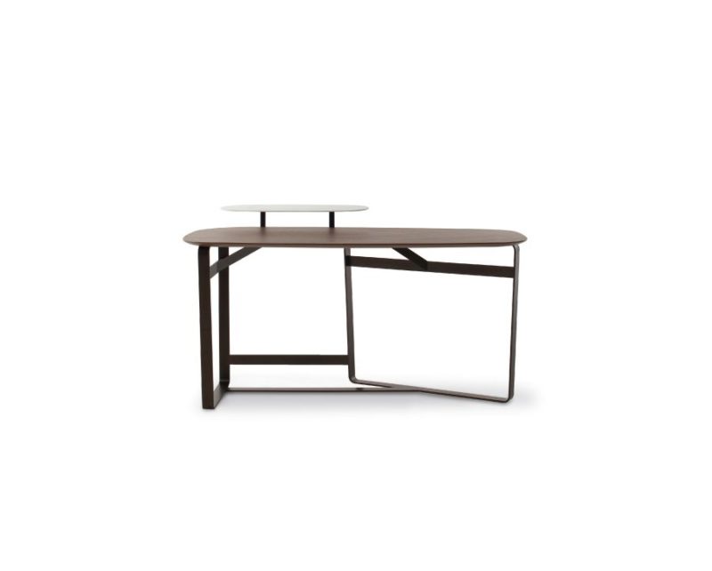 Materialien und Ausführungen: Platte aus Nussbaum Canaletto; Ablage aus Leder; Struktur aus lackiertem Metall (Weiß, Bronze, Anthrazit, Blei, Gold schimmernd, Platin) oder aus Metall mit einem matten Kupfer- oder Messingfinish > Maße:150 x 70 x h81 cm